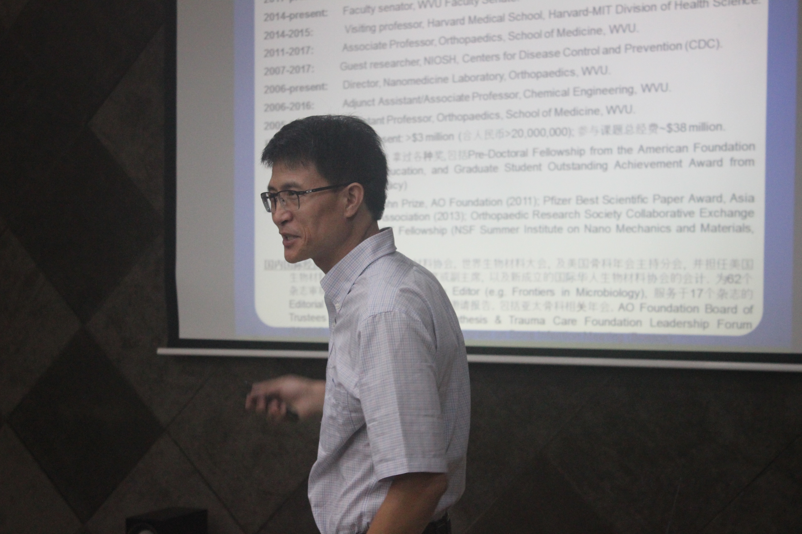 此次论坛还特别邀请到了美国(West Virginia University)西弗吉尼亚大学的李丙运教授,他主要向与会人员介绍了他对于材料在医学方面的应用的研究情况,还向学部同学抛出了西弗吉尼亚大学研究职位的橄榄枝。