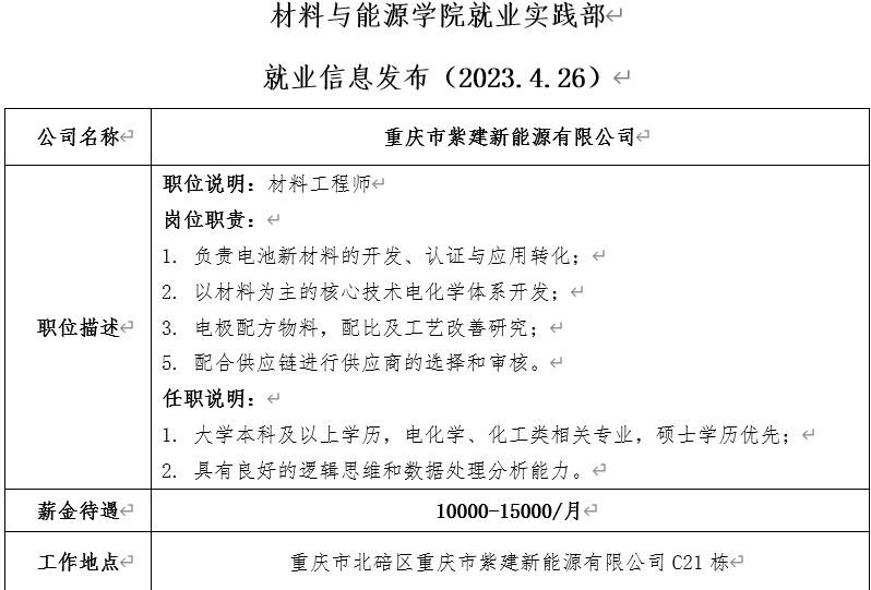 就业信息发布(2025 版权所有:PA视讯(国际)官方网站-PlayAce AG旗舰.4.26)——重庆市紫建新能源有限公司
