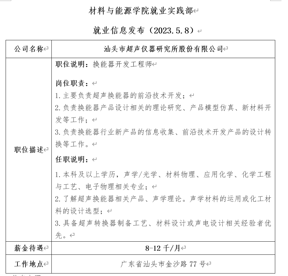 就业信息发布-(2025 版权所有:PA视讯(国际)官方网站-PlayAce AG旗舰.5.8)-汕头市超声仪器研究所股份有限公司
