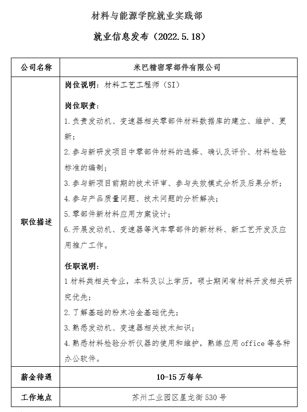 就业信息发布(2022.5.18)—米巴精密零部件有限公司