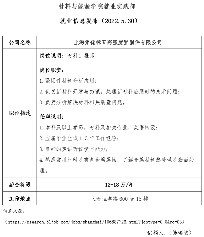 就业信息发布(2022.5.30)—上海集优标五高强度紧固件有限公司