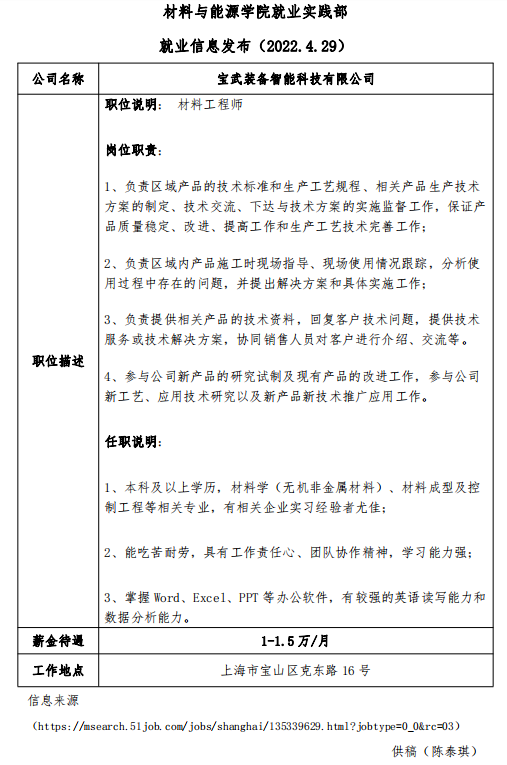 就业信息发布 2022.4.29—宝武装备智能科技有限公司