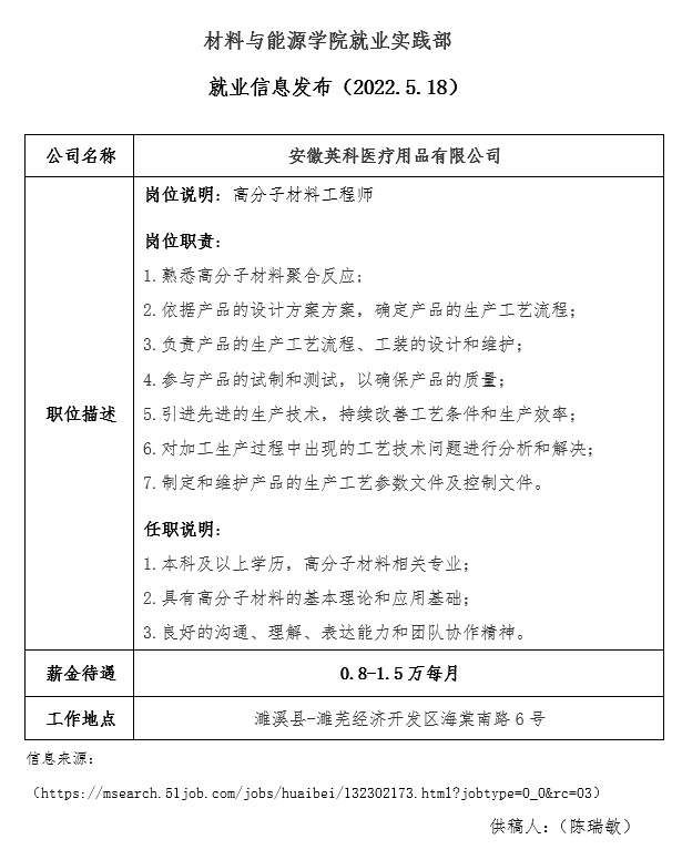 就业信息发布(2022.5.18)—安徽英科医疗用品有限公司