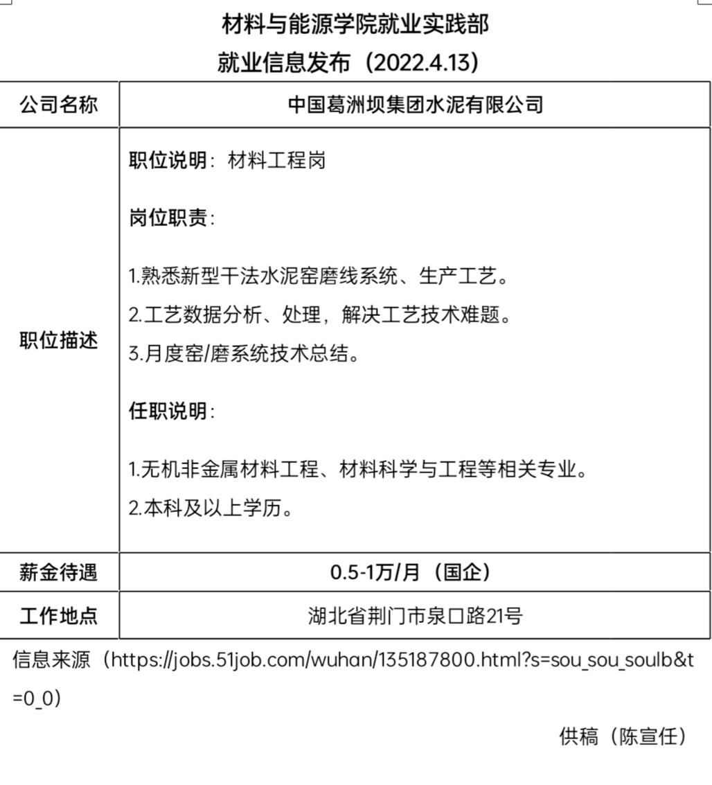 就业信息发布(2022.04.13)——中国葛洲坝集团水泥有限公司