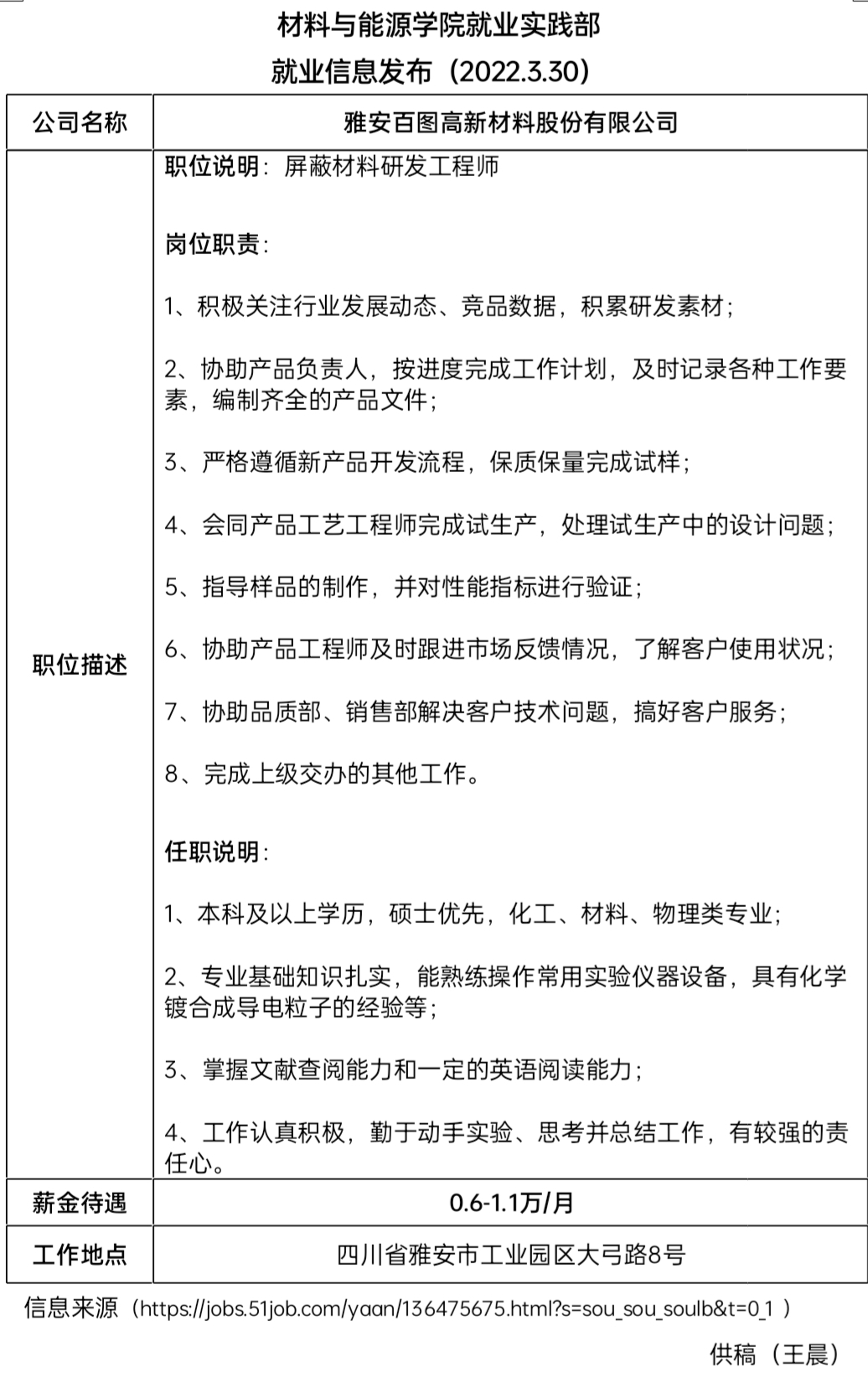 就业信息发布(2022.03.30)——雅安百图高新材料股份有限公司