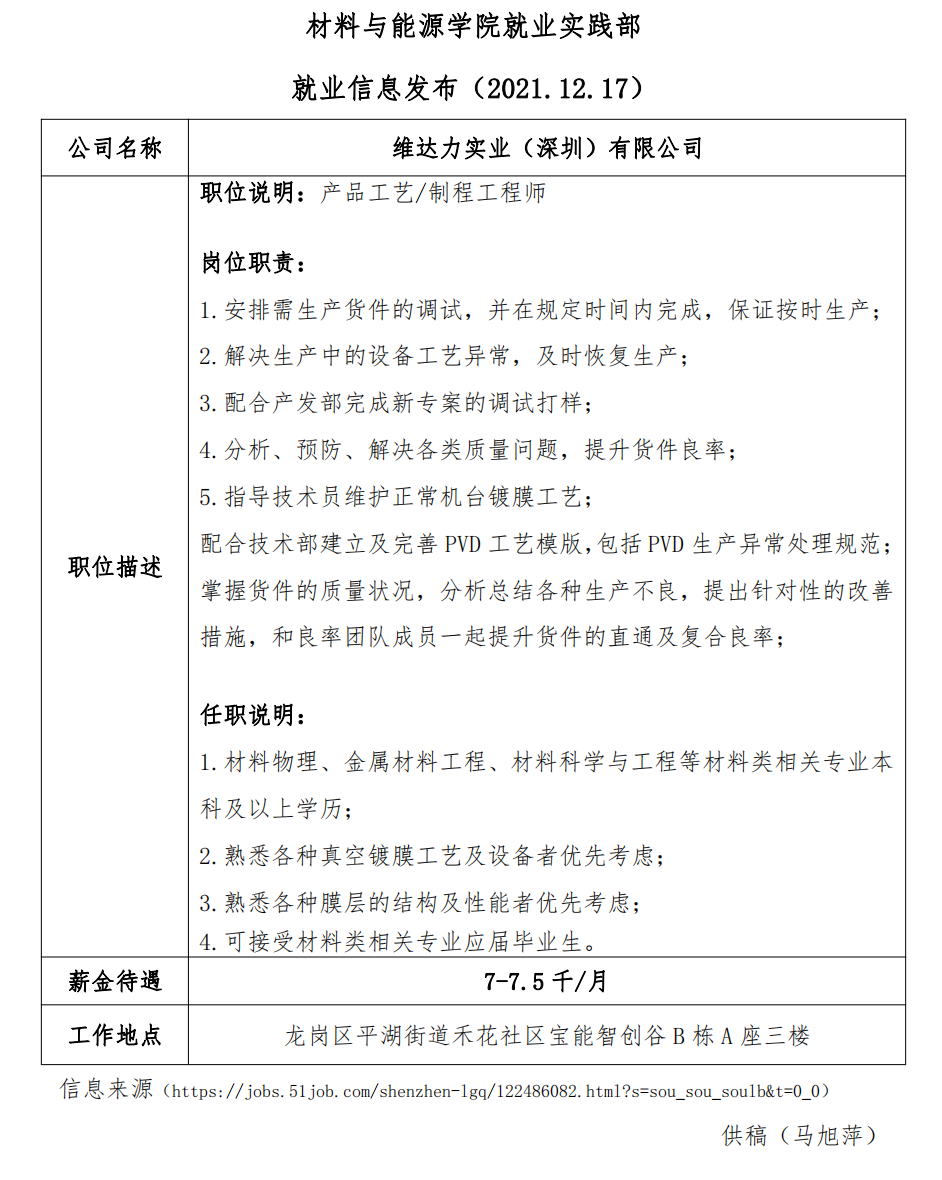 就业信息发布(2021.12.17)—维达力实业(深圳)有限公司