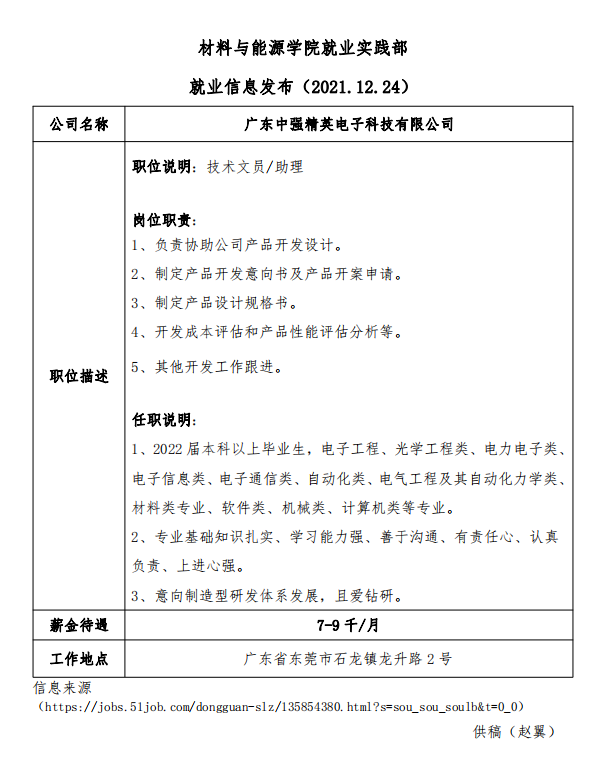 就业信息发布(2021.12.26)—广东中强精英电子科技有限公司