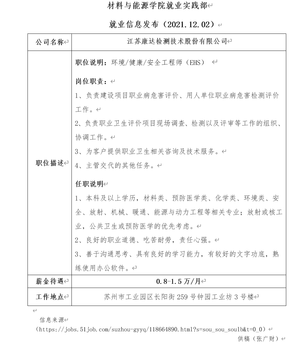 就业信息发布(2021.12.02)江苏康达检测技术股份有限公司