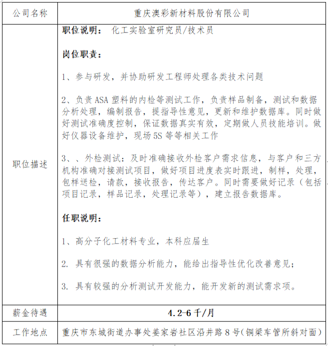 就业信息发布2021.6.18--重庆澳彩新材料股份有限公司