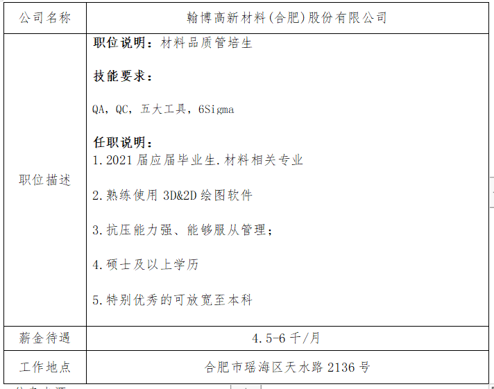 就业信息发布2021.5.14-翰博高新材料(合肥)股份有限公司