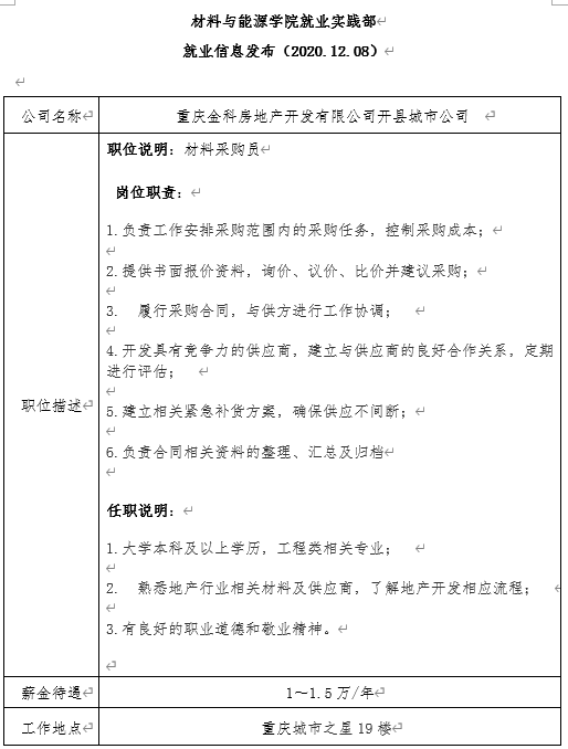 就业信息发布2020.12.08-重庆金科房地产开发有限公司开县城市公司