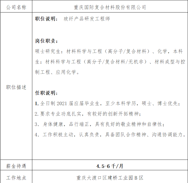 就业信息发布2020.11.8-重庆国际复合材料股份有限公司