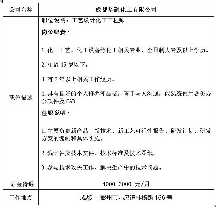就业创业中心20181211发布 -成都华融化工有限公司