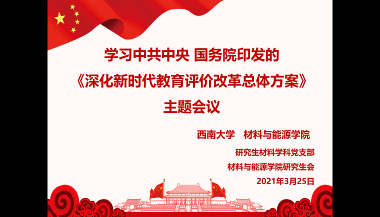 为深入贯彻落实习近平总书记关于教育的重要论述和全国教育大会精神,提高教育治理能力和水平,扎实推进新时代我校研究生教育改革发展,2021年3月25日下午,研究生材料学科党支部与研究生会在21教210教室,联合组织开展了专题学习研讨《深化新时代教育评价改革总体方案》(以下简称《方案》会议。 党委副书记刘昭暾同志,辅导员成果垒老师,研究生材料学科党支部党员和研究生会成员出席了本次会议,会议由学习部韩越同学主持。