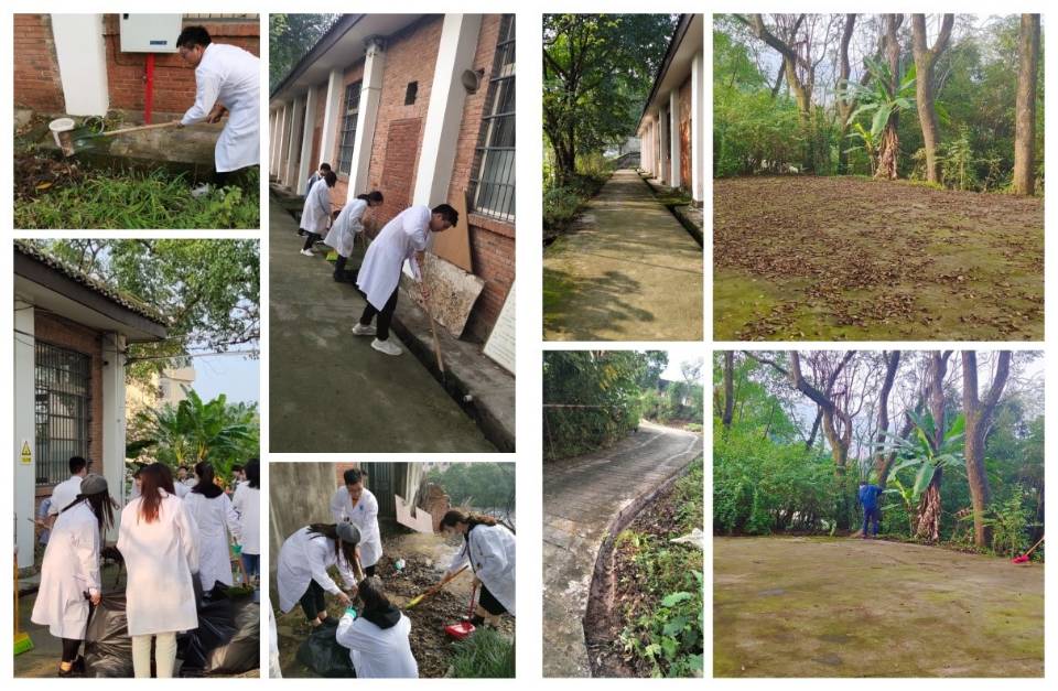 在两位老师的安排下,各位同志按照划定区域纷纷行动起来。清垃圾、扫树叶、伐树枝、锄杂草、铲淤泥,所有同志都热情满满、干劲十足,积极践行不怕苦、不怕累、不怕脏的“三不怕”精神。经过近一个半小时的“奋战”,原本被枯叶、杂草、垃圾环绕的实验室突然“换了人间”,变得十分干净、整洁、爽朗。