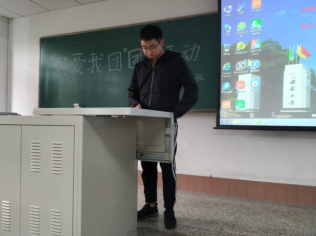 团支书播放爱国视频,全体同学一同回忆了国家发展的艰辛历史。
