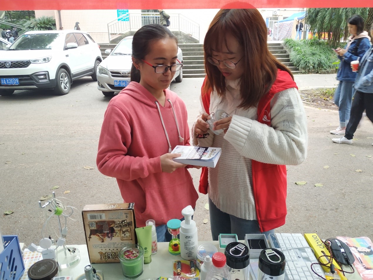 值班同学热情地为大家介绍爱心物品,邀请大家用闲置物品来交换自己需要的东西。许多同学看了爱心物品后,纷纷回寝室拿自己的东西来交换,如瑜伽垫,电脑散热板,首饰盒,书桌,书籍等。