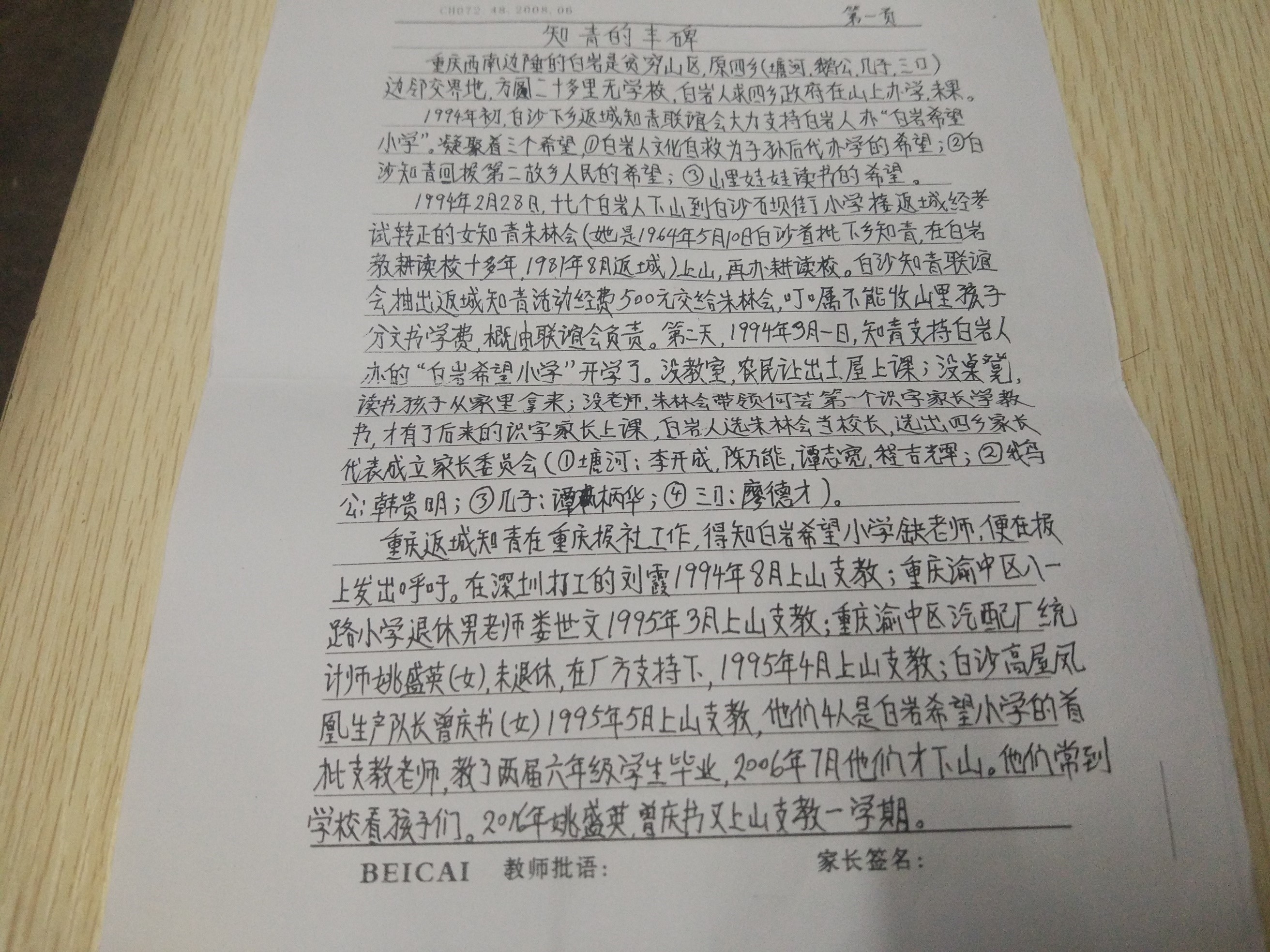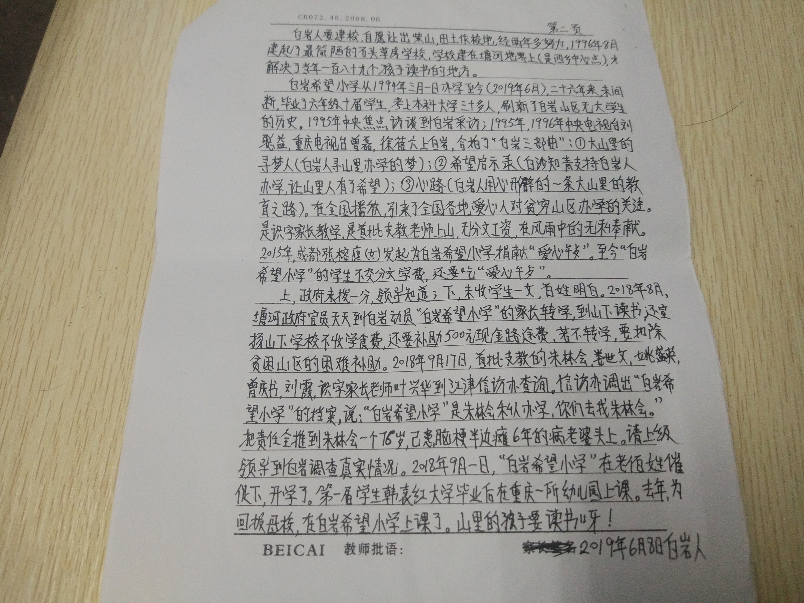 白岩是一个重庆西南边陲的贫穷山区,方圆二十几里没有学校,山里的孩子读书便成了问题。上个世纪,出现了大批知青返乡,白岩山区也是如此。为了解决山里孩子们的读书问题,白沙首批下乡知青朱林惠等自发成立了白岩希望小学,为白岩的教育事业献出了一份力,然而,此希望小学属于民办,一直没有得到政府的认可,也就是说这是一所“没有身份”的小学。一直以来,政府没有拨过一分款,整个学校从建设到运行全是由当地村民自己一砖一瓦建造起来的。后来,中央电视台焦点访谈节目组来到白岩实地采访,中央电视台联合重庆电视台六上白岩,合拍了白岩三部曲纪录片,在全国播放后,引起了全国各地爱心人士的对贫困山区留守儿童的关注,越来越多的人开始帮助白岩希望小学……