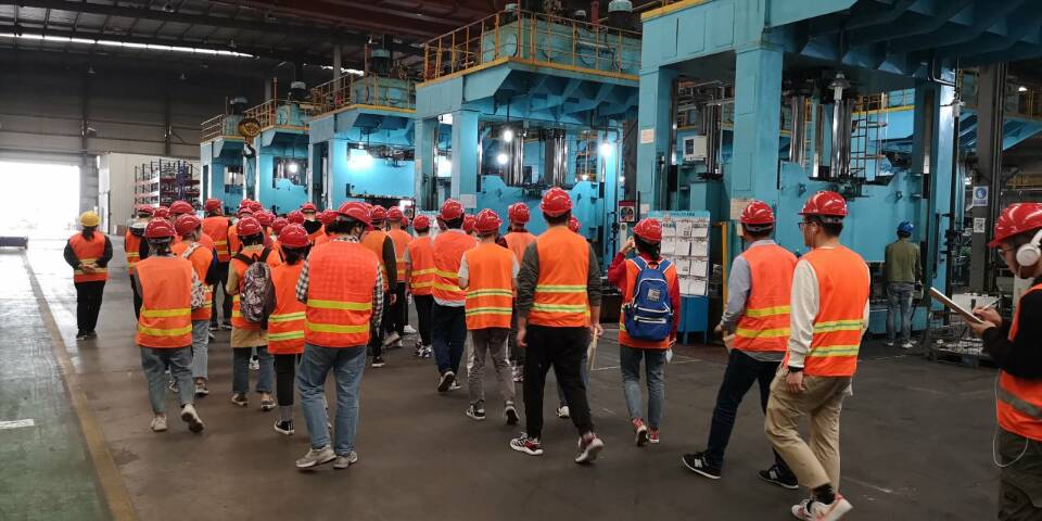 在公司工作人员带领下,同学们走进冲焊车间、注塑车间、装配涂装车间实地参观学习,同学们边走边看,不时同讲解员和工作人员互动交流,了解设备运作特点。在冲焊车间,同学们参观了电泳生产线、三条不同大小的冲压生产线、焊接生产线;在注塑车间同学们详细了解了注塑成型原理并现场观察了生产操作;在装配涂装车间同学们走进二楼全自动生产线,详细了解了汽车外壳从喷底漆到喷色漆再到流平、喷清漆全过程。