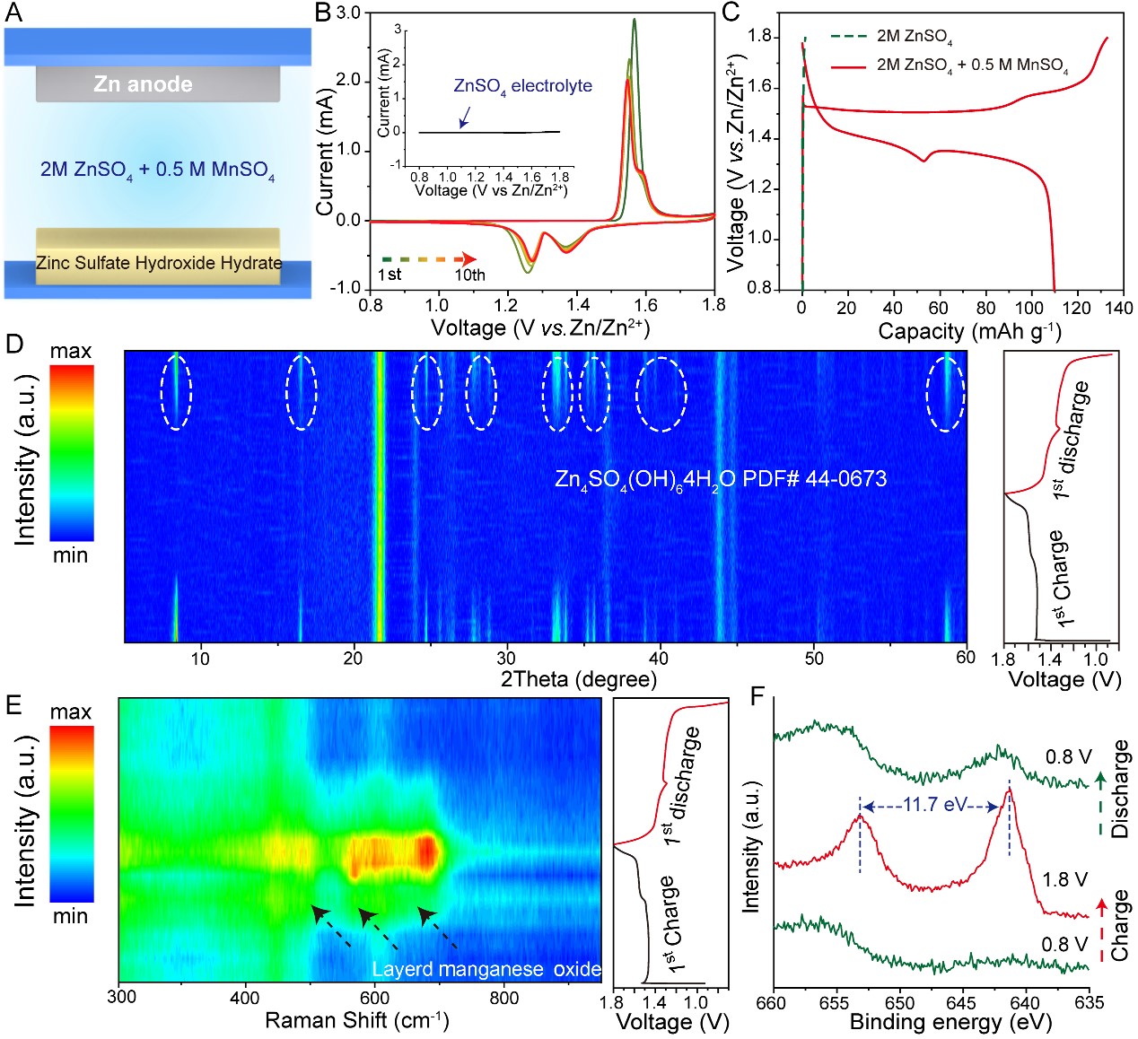 通过巧妙的电池设计,可以证明ZSH驱动的电解液中的Mn2+在充电过程中的沉积和放电过程中的溶解是电池容量的来源,并观察到沉积产物为水羟锰矿型的锰氧化物(ZnxMnO(OH)2),且ZSHZnxMnO(OH)2之间转变的可逆性和效率是电池稳定性的主要因素。