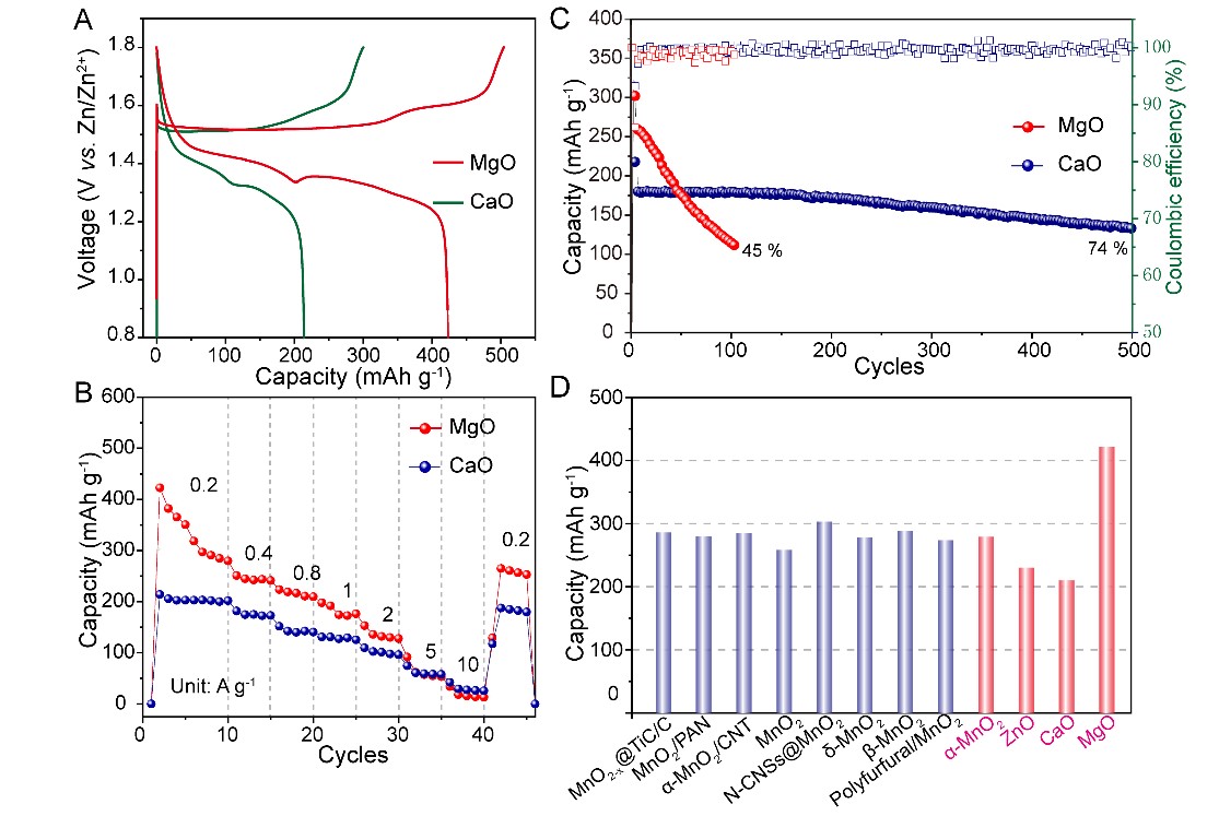 因此,MnO2电极在水系可充锌锰电池中的作用为诱导ZSH的形成和向电解液中释放Mn2+。因此,如果预先在电解液中添加一定的Mn2+,且正极表面存在ZSH,电极即可进行可逆的充放电。基于此推断,作者通过一系列实验,发现了许多可用作电池正极材料的非MnO2正极,包括ZnOMgOCao等氧化物。