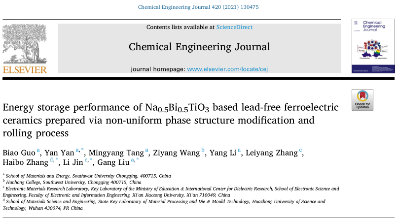 近日,PA视讯官网PA视讯官网严岩老师及合作者在钛酸铋钠基弛豫铁电陶瓷研究领域取得进展。相关成果以“Energy storage performance of Na0.5Bi0.5TiO3 based lead-free ferroelectric ceramics prepared via non-uniform phase structure modification and rolling process”为题发表在国际知名期刊《Chemical Engineering Journal》上。严岩老师为第一通讯作者,研究生郭彪为第一作者;PA视讯官网为该成果第一完成单位,西安交通大学和华中科技大学为共同完成单位。
