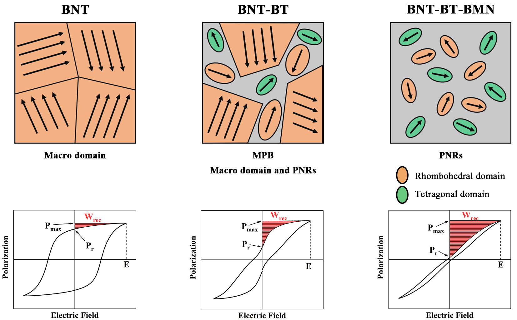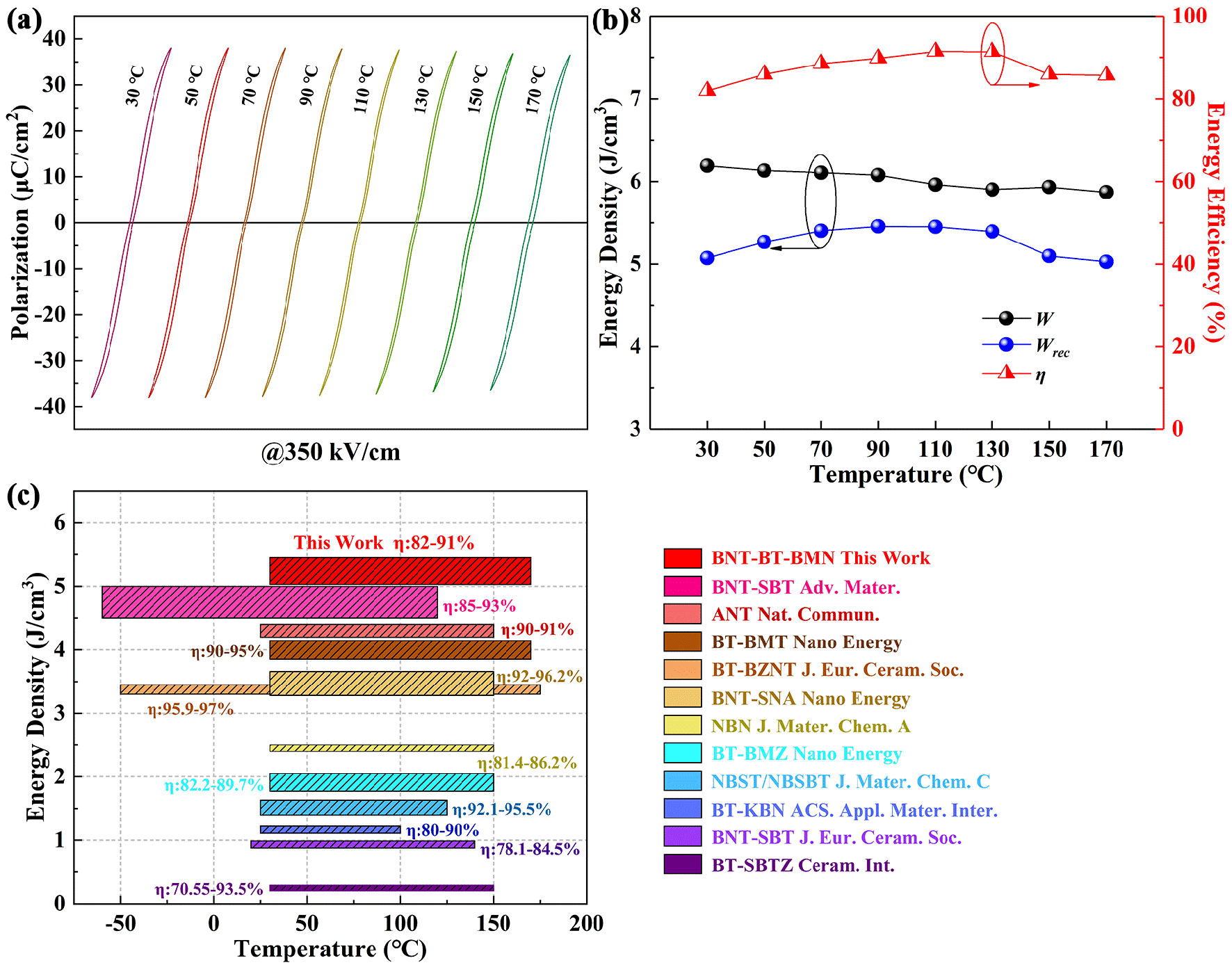通过上述研究方法,成功制备出了一系列的(0.94Na0.5Bi0.5TiO3-0.06BaTiO3)-xBiMg2/3Nb1/3O3弛豫铁电材料。BT的引入使材料在退极化过程中产生了“束腰”现象,有利于储能密度的提高。BiMg2/3Nb1/3O3的引入则使材料中残余的长程有序结构被进一步破坏,并对Bi元素在高温下的损失进行补偿,在降低Pr的基础上保证高Pmax,从而有效改善其储能性能。通过轧制工艺制备的陶瓷样品,其BDS显著提高,并由此带来更优异的储能性能。综上,0.85(0.94Na0.5Bi0.5TiO3-0.06BaTiO3)-0.15BiMg2/3Nb1/3O3陶瓷在420 kV/cm的电场下获得了6.3 J/cm3的超高储能密度,储能效率为79.6%。此外,通过极化失配的方法获得了优异的温度稳定性,在350 kV/cm的电场下Wrec > 5.03 J/cm3, η > 82% (30~170℃)。