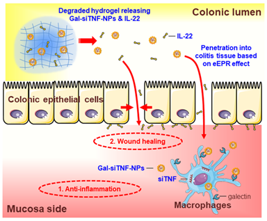 UC是一种现代难治病,传统治疗仅仅围绕如何降低炎症,远不能满足临床治疗需求。理想的UC治疗策略不仅要缓解炎症,还要促进受损黏膜修复。肖波教授课题组制备了一种半乳糖表面修饰载TNF-α siRNA(siTNF)纳米粒子,然后利用水凝胶包裹该具有抑炎功能的纳米药物和具有黏膜修复功能的IL-22,最后口服共载siTNF/IL-22水凝胶对UC展开协同治疗。研究证明该共载水凝胶可在炎症结肠部位有效崩解,进而释放所包裹的纳米药物和IL-22,最终同时实现缓解炎症和修复受损黏膜。