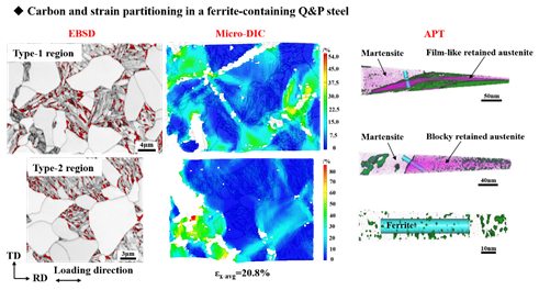 随着汽车轻量化的持续推进,汽车用钢不断向高强高塑性方向发展,由此催生出了汽车用先进高强钢(AHSS)。当前,汽车用AHSS已发展到第三代,最具代表性的钢种之一就是淬火配分(Q&P)钢。该论文针对含铁素体型Q&P钢中TRIP效应有效性低和软硬相协调变形性差的问题,运用准原位拉伸与微观DIC及EBSD技术相结合的方法,重点研究了软硬相应变配分与TRIP效应和强塑性之间的关系。同时,利用APT技术对含铁素体型Q&P钢中各相之间的碳配分展开了系统定量研究。在上述研究基础上提出了基于碳配分及应变配分控制的含铁素体型Q&P钢组织性能综合调优策略。该研究结果得到国内外同行的一致认可。