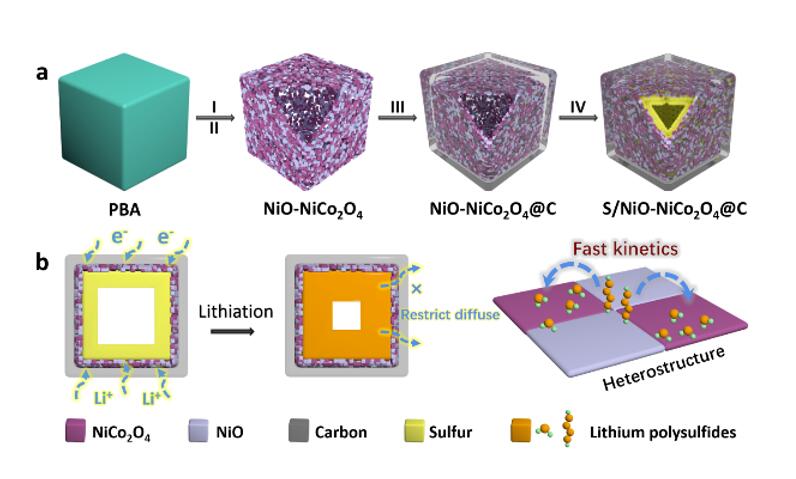 随着环境问题的日益严峻以及电子电动设备的迅猛发展,设计和开发高效的储能设备势在必行。锂硫电池因具有高能量密度、髙理论容量、硫正极资源丰富、价格低廉以及环境友好等特点,被认为是下一代最有前景的能量存储系统之一。然而,由于硫正极材料及其放电产物硫化锂导电性差,充放电过程中的体积效应以及“穿梭效应”等问题,致使电池中硫的利用率低,容量衰减快,倍率性能差,严重阻碍了锂硫电池的商业化进程。针对这些问题,徐茂文教授课题组设计并合成了双层核壳NiO-NiCo2O4异质结@C空心纳米笼作为硫的载体,并首次应用于锂硫电池中。这种空心结构不仅能够为硫的存储提供充足的空间,还能有效应对硫充放电过程中的体积效应; 此外,NiO-NiCo2O4异质结纳米笼能够利用自身组成的独特优势,有效抑制多硫化物溶解扩散并促进其转化反应中的动力学过程,缓解电池的穿梭效应,充分体现了异质结的优势。基于这种独特的设计,该材料作为锂硫电池的正极,表现出较高的比容量以及良好的循环稳定性。
