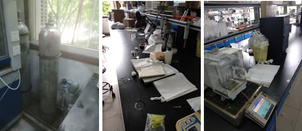 在安全检查过程中,工作小组详细查看了实验室的安全责任体系和制度建设、实验操作规程、登记记录、设施条件及相关标识等,特别是化学药品的存放、废液的储存和回收、气瓶的管理等情况做了重点检查。通过检查发现,目前学院实验室的管理日益规范,但仍存在一些安全隐患:21教学楼220实验室使用一氧化碳高危气体,气瓶未固定且缺乏相应的管理措施;21教410实验室垃圾乱放;后山实验室雨后漏水。安全工作小组在现场对检查中发现的问题做好了记录,要求相关责任人高度重视,尽快完成安全问题整改,进一步强化实验室管理,为广大师生营造一个和谐安全的实验环境。