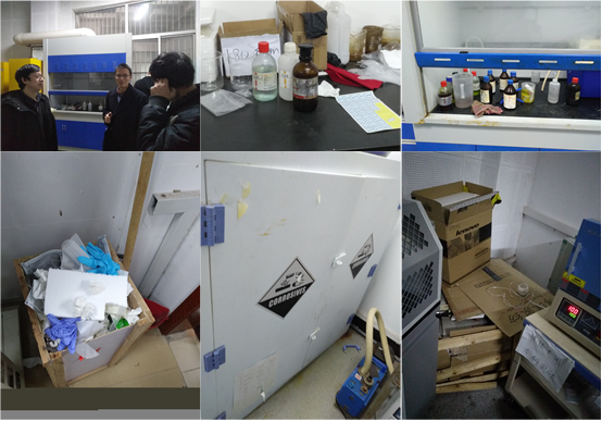 检查从8689教本科教学实验室开始,由于学校隔断缙云美食城,8689教进出道路被堵,目前只能从档案馆后方一条小道进出。该条小道比较陡峭,而且路况较差,请学部全体师生进出时务必格外小心。8689教经过暑期整改后,已经面貌一新,但是仍然存在部分化学药品乱摆放情况。安全工作小组随后来到25教进行检查,检查过程发现25教部分实验室摆放较多易燃物,设备拆箱后的纸箱木架未及时丢弃。最后,实验室安全工作小组来到21教科研实验室进行检查。21教存在的安全隐患包括:部分学生未穿实验服、实验桌面地面不整洁、实验垃圾堆积太久、双锁药品柜未锁、通风橱内脏乱等情况。安全工作小组在现场对实验室安全隐患提出了整改措施,要求相关责任人高度重视,尽快完成隐患问题整改,以营造和谐安全的实验环境。