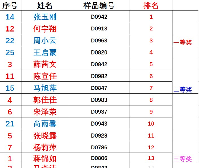 比赛分为A、B两组进行。经5位学院专业评委双盲评分,最终评选出3个一等奖、4个二等奖、6个三等奖,具体名单如下。学院拟排出本次校赛成绩位列前茅的同学参加6月份在重庆大学举办的重庆市复赛(前8名)和8月份在郑州大学举办的国赛(待定)。