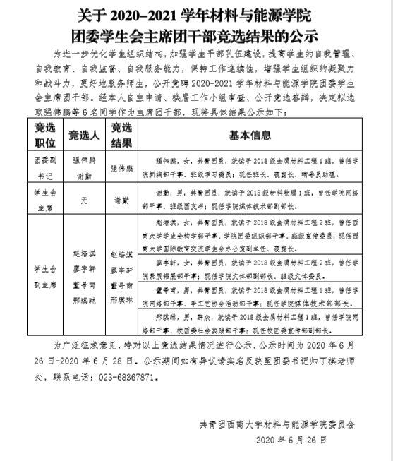 关于 2020-2021 学年PA视讯官网 团委学生会主席团干部竞选结果的公示