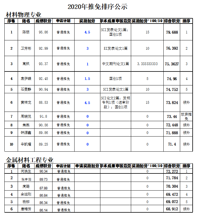 2020年推荐优秀应届本科毕业生免试攻读硕士研究生工作经本学院2016级学生自愿申请,学院本年级考评组对申请者的学习成绩和申请材料进行初步审核,对其学习和思想品德进行评议,学院专家组对申请人的科研成果及获奖进行审核认定、答辩评议,推免考评工作组对学生成绩积分进行计算审核,推免工作领导小组按照文件对申请人成绩积分、奖励积分进行了统计排序,现将推免结果公示如下: