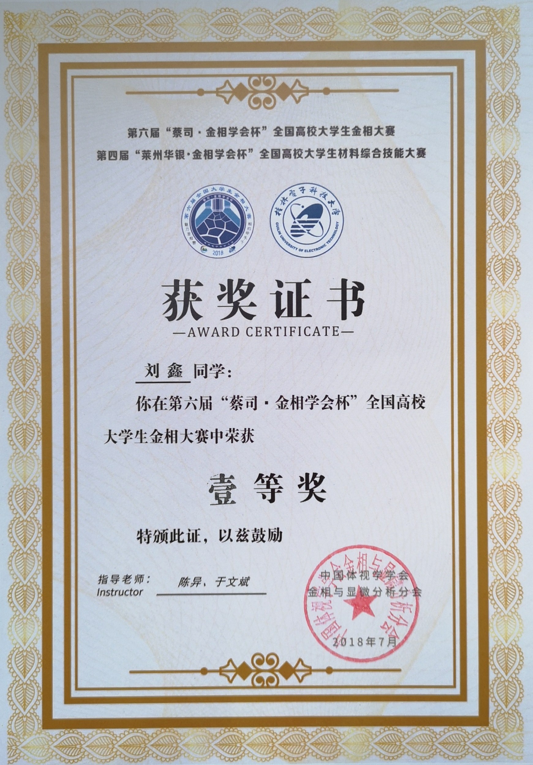 刘鑫同学获得金相大赛一...
