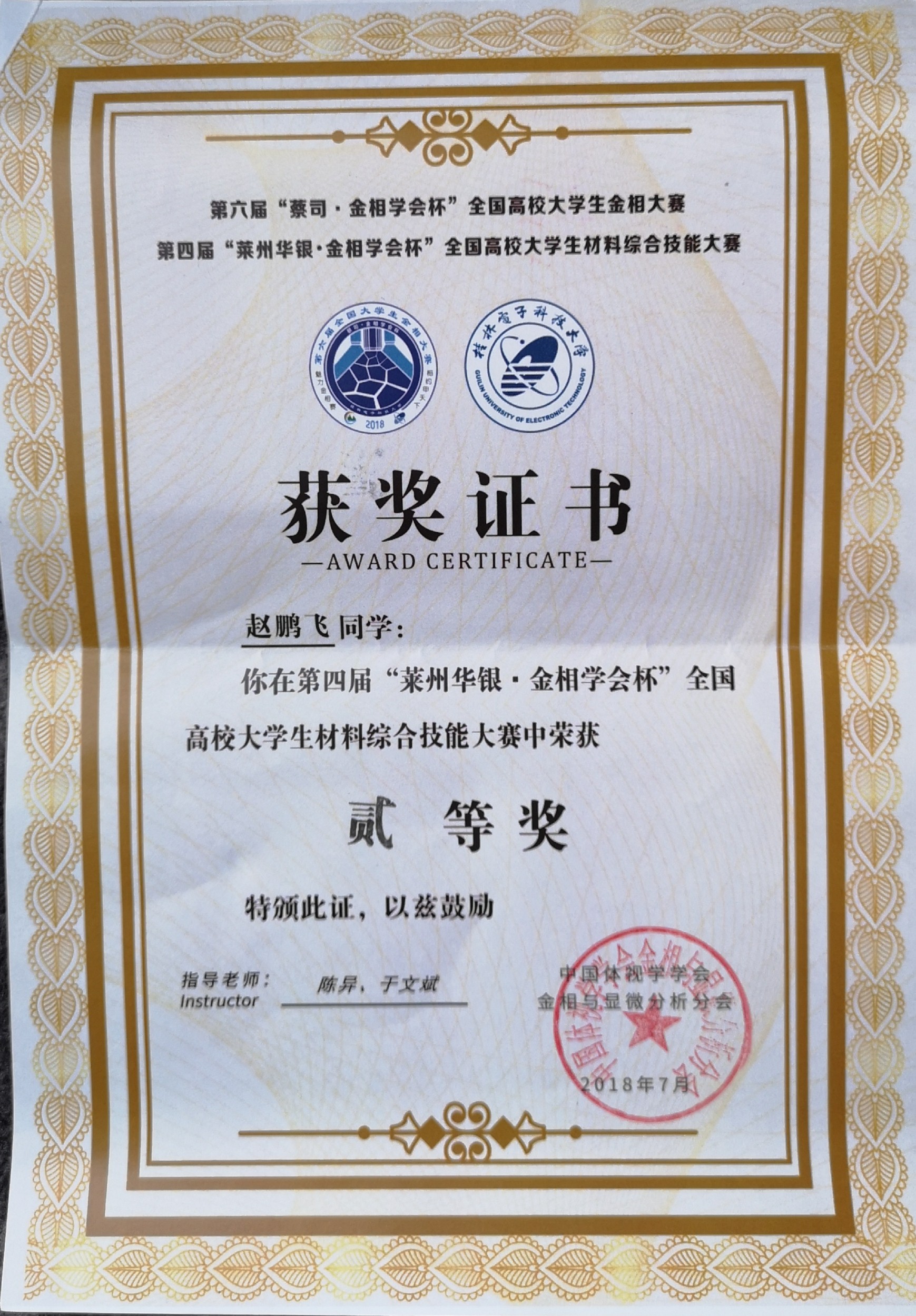 赵鹏飞同学获得材料综合...
