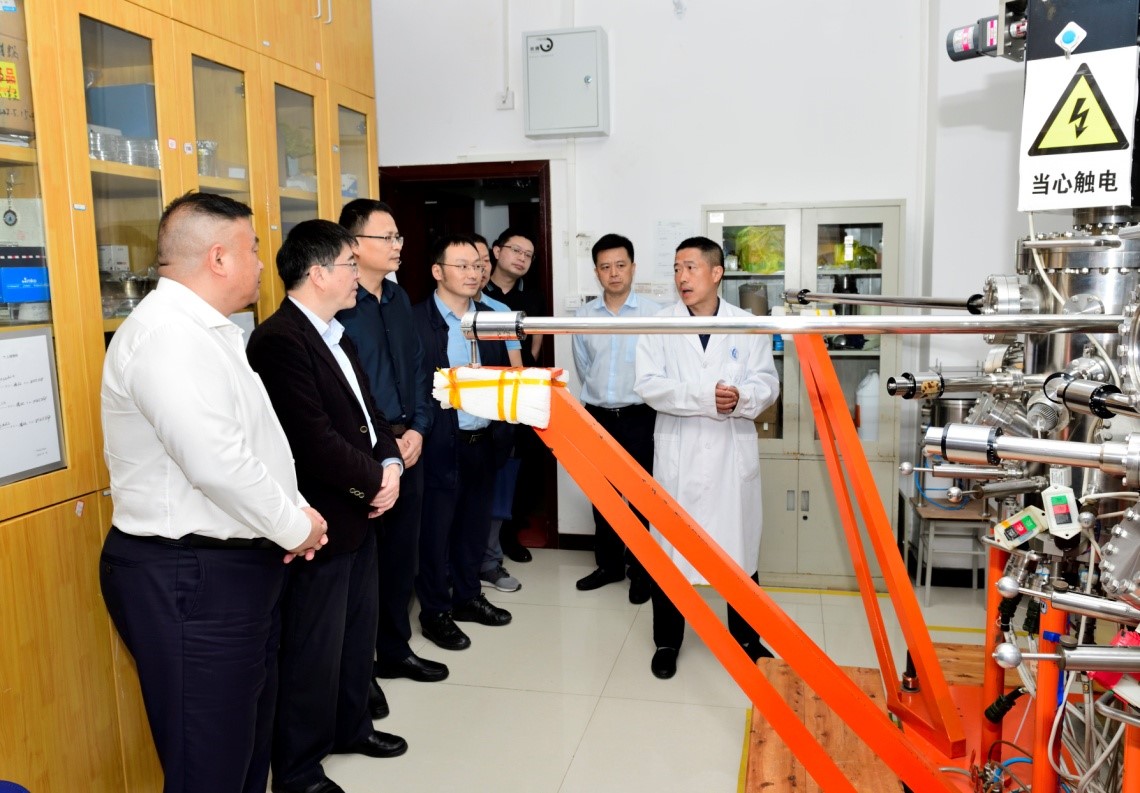 随后,领导们来到了宋群梁教授课题组可再生能源实验室,宋群梁教授就本组在钙钛矿太阳能电池、纳米摩擦发电、忆阻器等方面取得的研究成果及相关设备的研发进行介绍,简要介绍太阳能电池与纳米摩擦发电在实现“碳达峰、碳中和”战略目标中的重要性以及阐述了相关研究在实现应用中面临的问题。马主任和李书记等人向宋群梁教授详细了解了太阳能电池和纳米摩擦发电的相关问题,对宋教授组内以低成本自行研发高端设备给予肯定与鼓励,对组内于西部博览会中“神奇的水滴发电”展示表示称赞,并对当前取得的研究成果给予肯定。