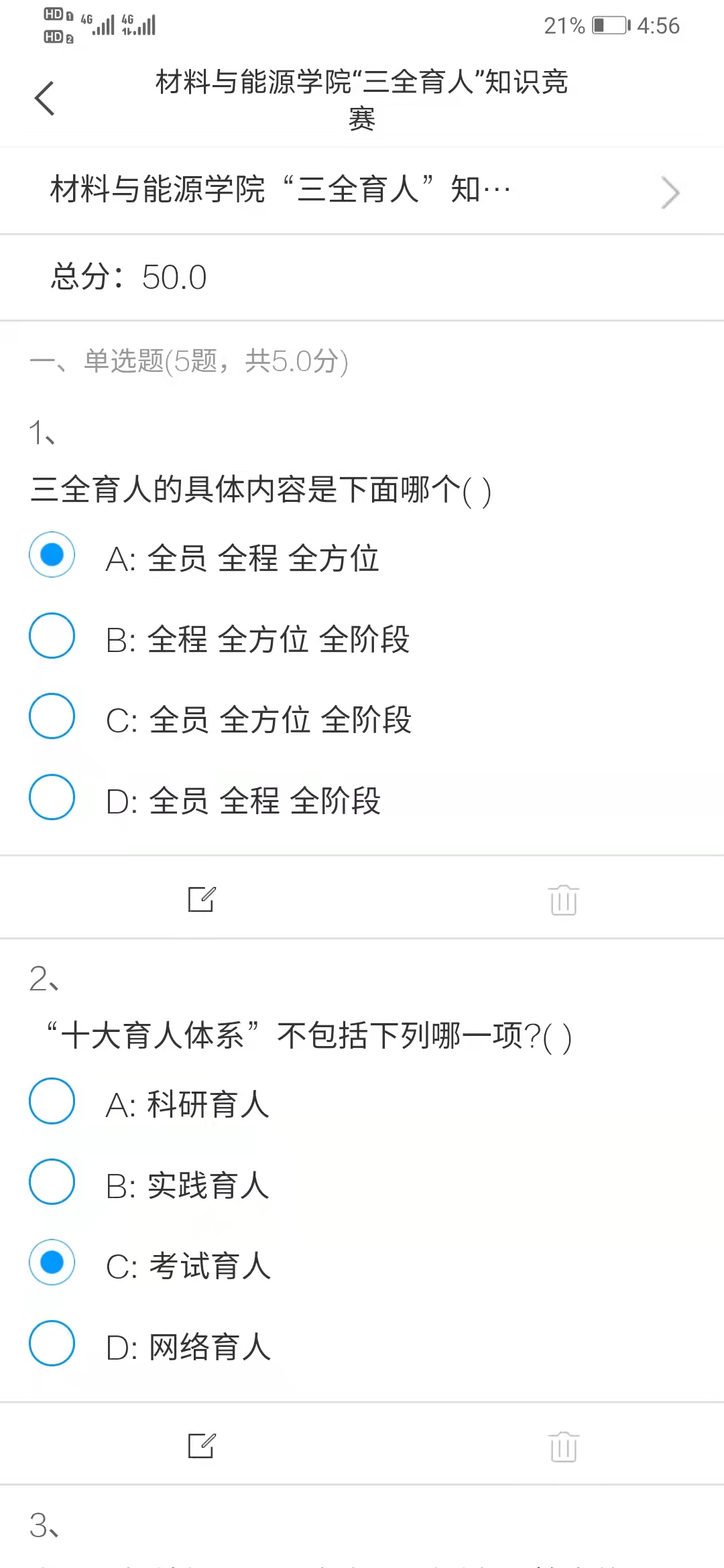 为切实增强做好“三全育人”,强化担当,以行践知,我院从“三全育人”知识题库随机抽取5道单选题、20道多选题、5道判断题,通过学习通app进行竞答。此次知识竞赛,让教师们更深层次的理解了对坚持和加强党对高校的全面领导,紧紧围绕立德树人根本任务,充分发挥中国特色社会主义教育的育人优势,以理想信念教育为核心,以社会主义核心价值观为引领,以全面提高人才培养能力为关键,形成全员、全程、全方位育人的格局。
