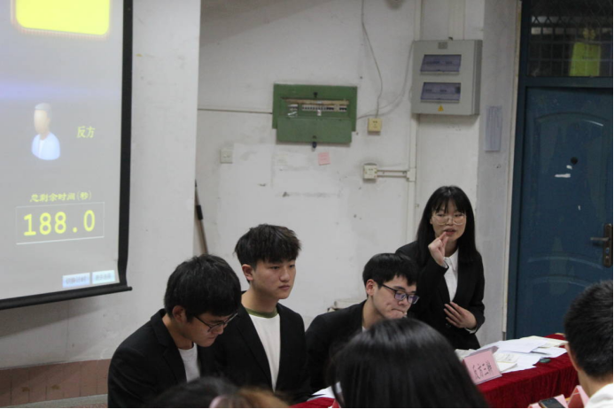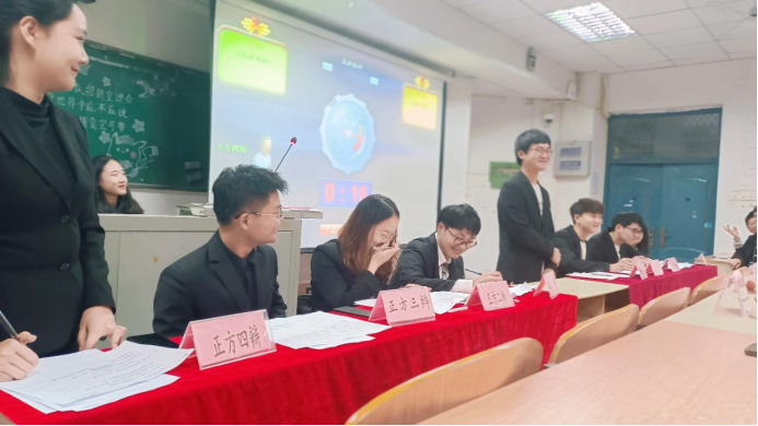 紧接着,辩论赛正式开始。由正方一辩先声夺人陈述本方观点拉开战幕,面对正方振振有词的立论,反方辩手从容不迫,沉着应战,一场激动的拉锯战就此拉开序幕。在辩论赛进行过程中,八位辩手娓娓道来,妙语连珠,巧妙地站在道德和法治层面对辩题进行辩论。不论是立论阶段,还是驳立论环节;不论是进行质辩,还是自由辩论,正反方辩手都紧紧相扣,一环接一环,“针锋相对”,用最犀利的语言去支撑自己的论据,发挥出了自己应有的水平,展现出了自己的实力,现场观众无一不激情高昂,拍案叫绝,一波接一波的掌声将此次辩论赛推向高潮!