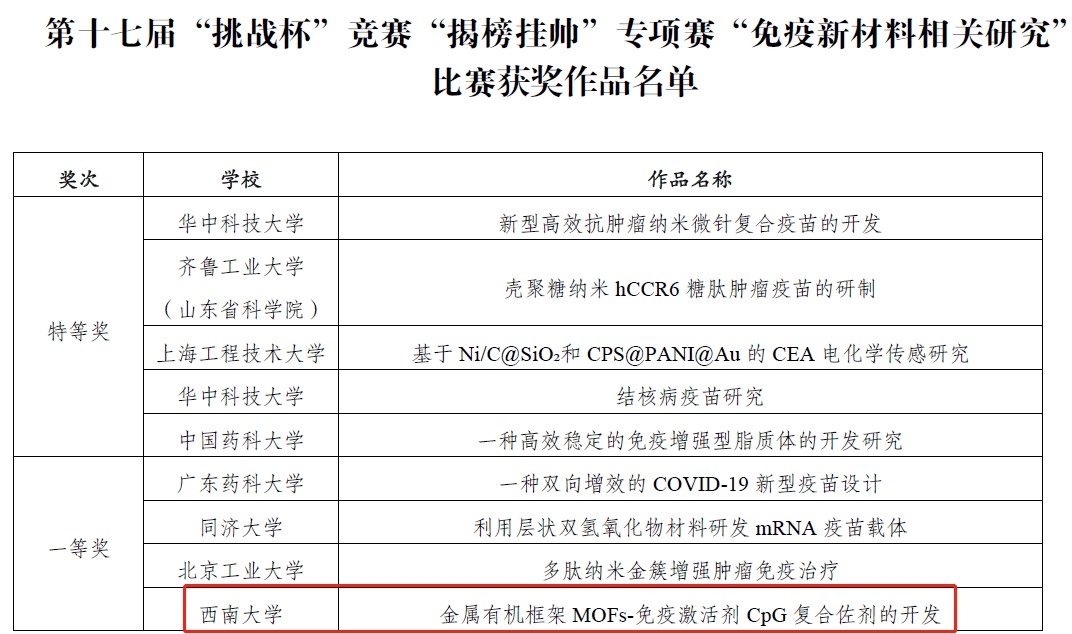 近日,第十七届“挑战杯”全国大学生课外学术科技作品竞赛(以下简称“‘挑战杯’竞赛”)“揭榜挂帅”专项赛“高效率球形钛合金粉末制备新原理新工艺研究”和“免疫新材料相关研究”比赛获奖作品揭晓,经评审委员会资格审查、初审和复审,我院2项学生作品脱颖而出,取得优异成绩,其中李婧老师和蒋显全教授指导的学生团队(作品名称:高效率球形钛合金粉末制备新原理工艺研究)斩获特等奖,刘英帅教授指导的学生团队(作品名称:金属有机框架MOFs-免疫激活剂CpG 复合佐剂的开发)荣获一等奖。