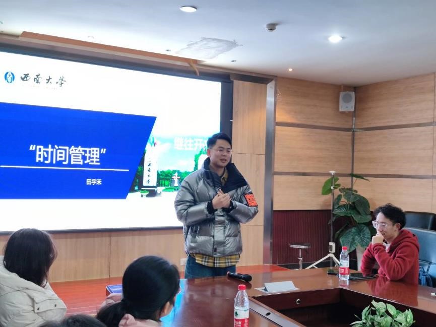 田宇禾学长做保研经验分享。田宇禾学长的讲话以“时间管理”为主题,告诉同学们要把工作和学习分开,互不影响,并且要分清主次,目的性一定要强。他指出,学生会干事、干部、主席之间应相互促进,并告诉学生组织的成员们要精确定位、明确目标、创新想法、恪尽职守、保持初心。
