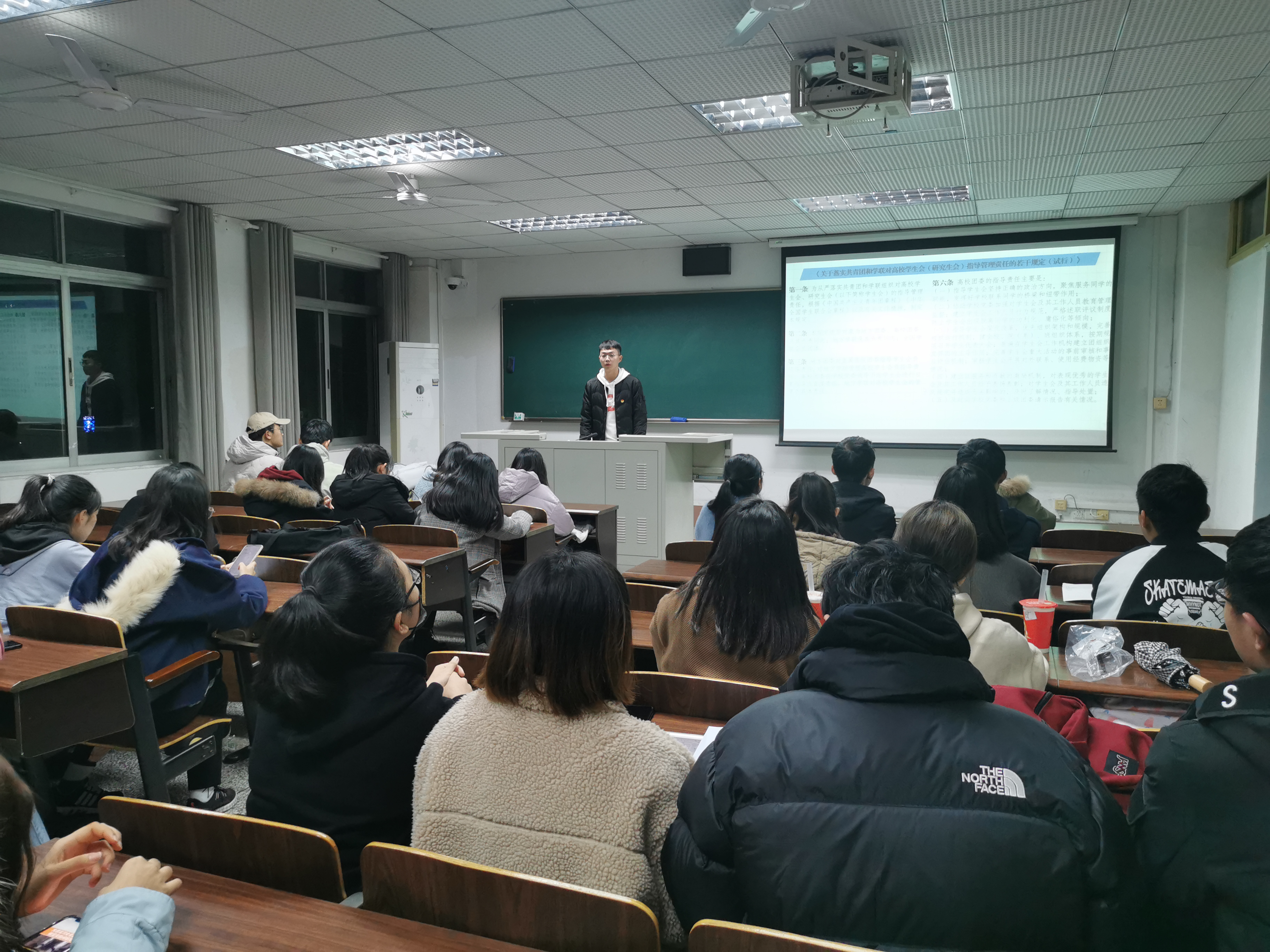 此次活动的主持人为组织部部门负责人姚灏,活动首先是对共青团中央全国学联印发《关于落实共青团和学联对高校学生会(研究生会)指导管理责任的若干规定(试行)》的通知和全国学联印发《关于学联学生会工作人员改进作风服务同学的若干规定》的通知,两份文件进行传阅和细致解读,强调学生组织成员应该恪守学生本分,牢记服务宗旨,学会服务他人,严格杜绝拉帮结派和官僚主义。