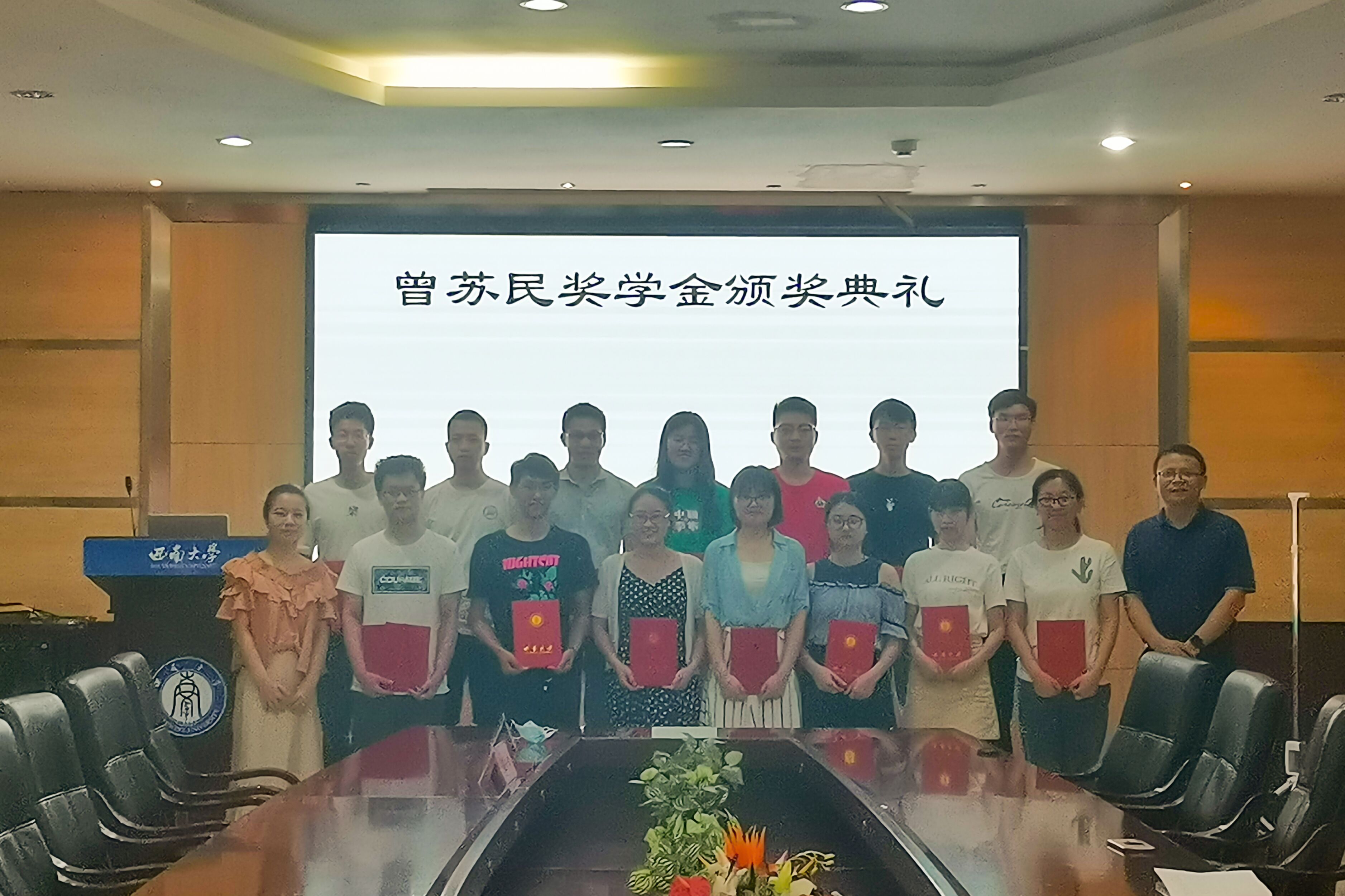 随后由徐茂文副院长为郭秉淑、梁滔滔、杨婷婷等七名研究生颁发了曾苏民卓越科研奖学金证书,接着为陈朋,何焕生等七位本科生颁发了曾苏民专业奖学金和曾苏民科研奖学金。