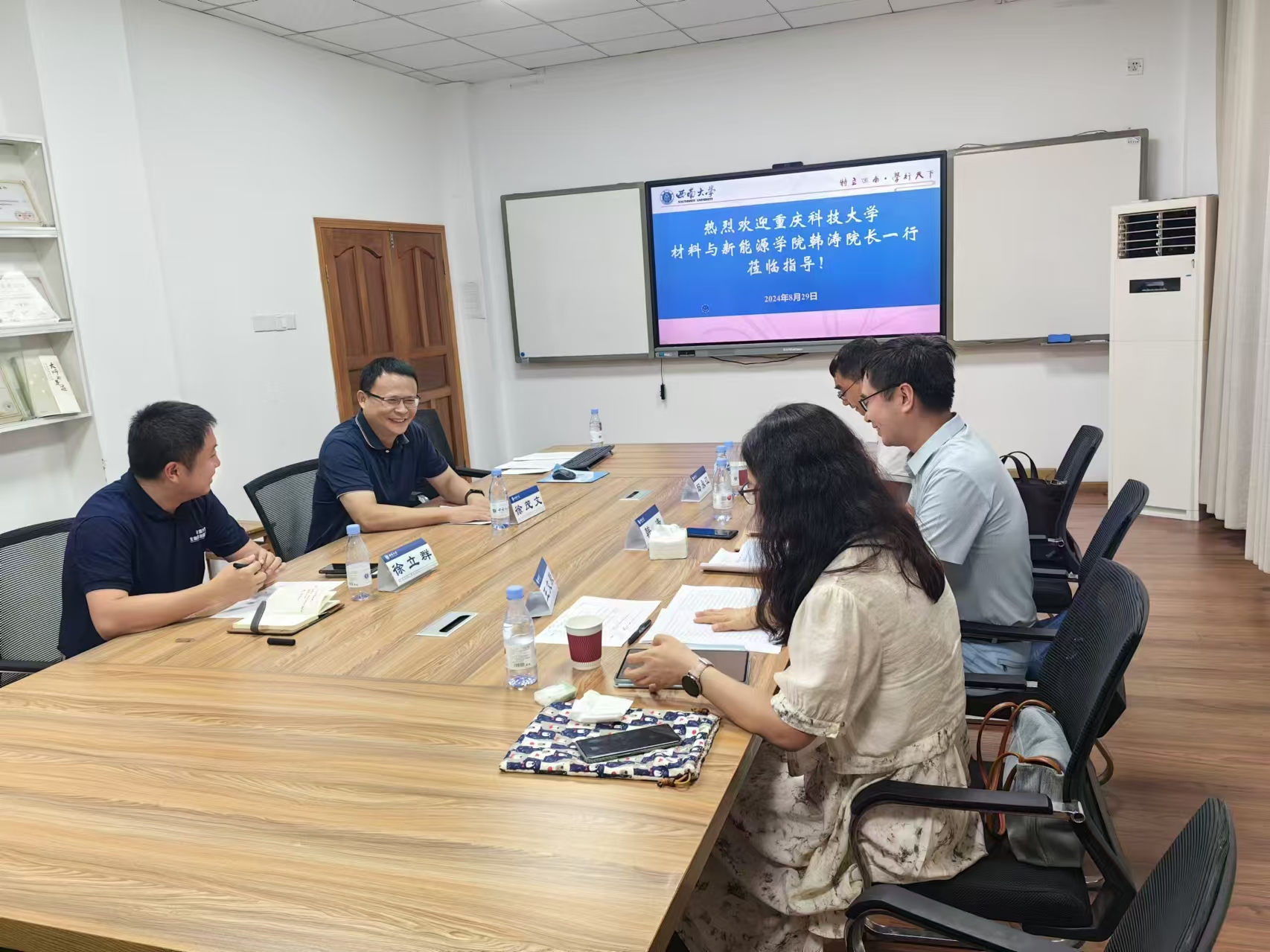 2024年8月29日,重庆科技大学材料与新能源学院韩涛院长一行莅临我院指导交流,随行人员有重庆科技大学材料与新能源学院学科科研办公室邸永江主任和王文荣秘书。我院徐茂文院长、徐立群副院长及曾洲老师接待并参与了此次会谈。