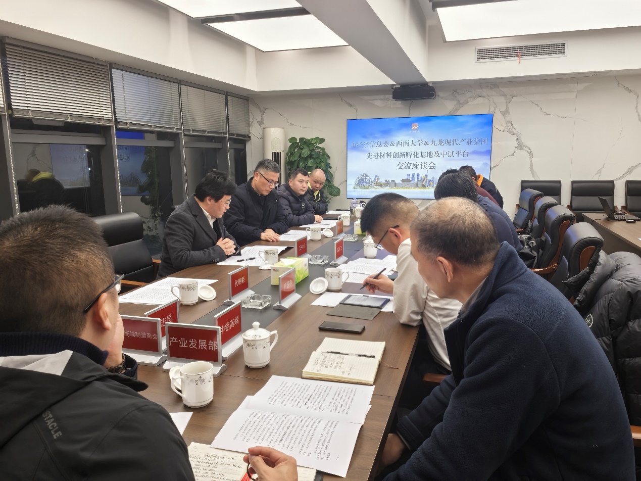 12月19日,学院党委书记梁武、院长王中长、副院长郭胜锋一行赴重庆九龙现代产业集团洽谈新材料中试平台建设工作。重庆市经信委材料处张博处长、柴美厚三级调研员,重庆九龙现代产业集团党委书记、董事长蒋小飞和副总经理严国存,重庆国创轻合金研究院副总经理王彬及中铝高端有关人员参加座谈交流。
